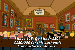 I have 125. Do I hear 130? $130r000 for this authentic Comanche headdress? I got 130. Do I hear 135? 140? Do I hear-- 135, going once. I'm the only one here who's got nothing, you know?