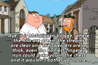 Aye, it is McSwiggen Village, where the hills are green, the streams are clear and the sweaters are so thick, even the boniest-fingered nun could poke you in the chest and it wouldn't bother you none.