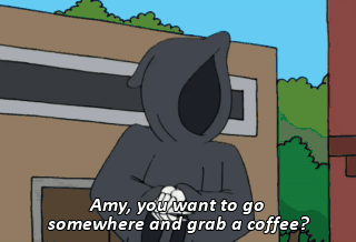 Amy, you want to go somewhere and grab a coffee? Sure. I get off at 2:00. GrEAT! Uh, uH, Great! I'll meet you here.