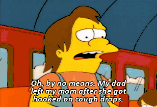 Oh, by no means. My dad left my mom after she got hooked on cough drops. By the end, her breath was so fresh, she wasn't really my mother anymore. Oh. So I guess I'm not alone.