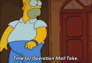 Time for Operation Mail Take. Can I help you ? Oh, don't be frightened of this. It's nothing but a letter opener. Who are you ? Don't tell him. Give him a fake name. Homer Simpson. Doh ! Simpson, huh ?