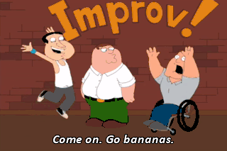Come on. Go bananas. Am I doing it? Am I doing it? Fuck's the matter with you guys? All right, let's try something else. Okay, this is a warm-up exercise called "One-Word Story."