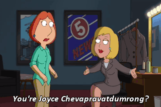 You're Joyce Chevapravatdumrong? Yes, but they'd never let that name on TV, so I changed it to Kinney. You ruined my adolescence, Lois.
