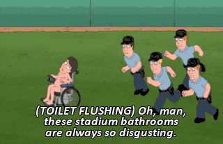 (TOILET FLUSHING) Oh, man, these stadium bathrooms are always so disgusting. Look at that. There's even a guy taking a crap in the sink. Oh, the last guy totally wrecked this sink.