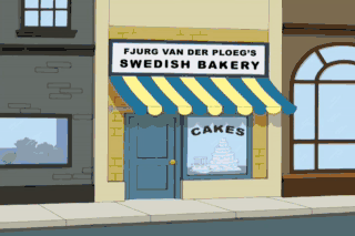We are gonna get you back on your feet, Brian. I know what always makes me feel better, delicious sweets. Halloo! Welcome to Fjurg's Bakery. Would you like a hot piss of pee? It's on the hoose!