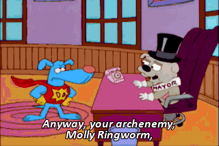 Anyway, your archenemy, Molly Ringworm, has threatened to destroy the city with her puke ray and-- Whaa! The mayor's barf is worse than his bite. Ah, le mot juste.