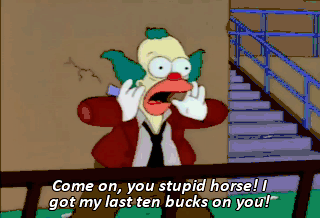 Come on, you stupid horse! I got my last ten bucks on you! No, don't look at me! Run! No!