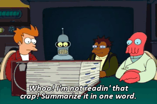 Whoa! I'm not readin' that crap! Summarize it in one word.