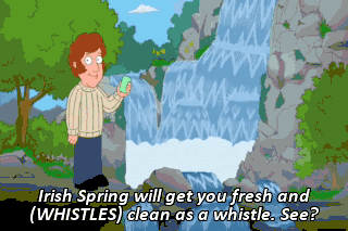 Irish Spring will get you fresh and (WHISTLES) clean as a whistle. See? (SCREAMS) You cut me! Why? What is that possibly supposed to show the consumer? There's more soap inside the soap. They know that!