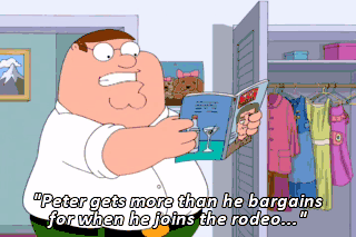 "Peter gets more than he bargains for when he joins the rodeo..." Boy, did I. "...and Meg dates a prison escapee"! Oh, no. Luke, run!