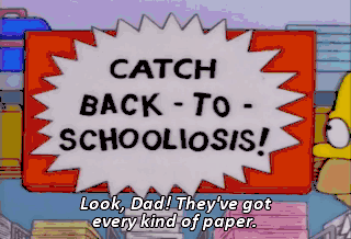 Look, Dad! They've got every kind of paper. Loose-leaf, graph, unlined-- College-ruled. Can't you just write on your arm like I do? All you're getting is rubber bands and paper clips?