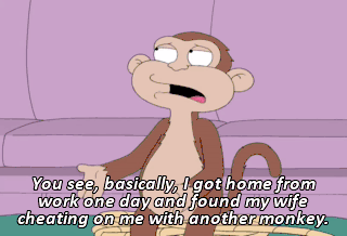 You see, basically, I got home from work one day and found my wife cheating on me with another monkey.