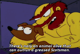There's nary an animal alive that can outrun a greased Scotsman. Now, out we go. 'Tis more dizzyin' than the belfry at St. Corgegluynwaagen's.
