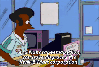 Apu Nahasapeemapetilon, you have disgraced the Kwik-E-Mart corporation.
