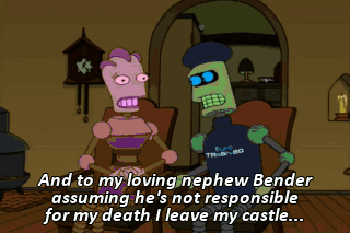 And to my loving nephew Bender assuming he's not responsible for my death I leave my castle... Yes! Let's stay there tonight. On condition that he spend one night within its walls. Oh, man, there's always a catch!