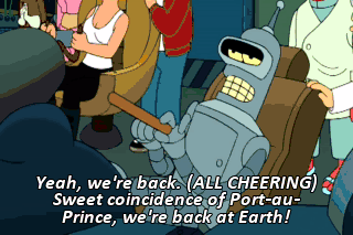 Yeah, we're back. (ALL CHEERING) Sweet coincidence of Port-au-Prince, we're back at Earth!