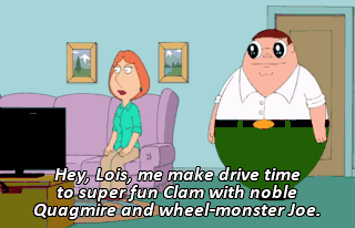 Hey, Lois, me make drive time to super fun Clam with noble Quagmire and wheel-monster Joe. Go force!