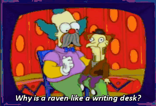 Why is a raven like a writing desk? I don't know. Why is a-- Hey, the dummy can't hurt you. He's not even alive. He's dead!