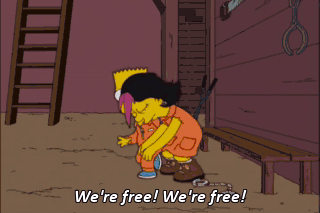We're free! We're free! Bart, I'm gonna miss you so much. Hey, the next time my mom asks me to help around the house, I could come live with your family. (GRUNTS) Don't get fresh with me, jerk!