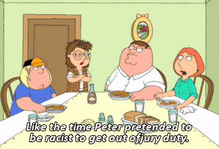 Like the time Peter pretended to be racist to get out ofjury duty. Awful lot of honkies in here.
