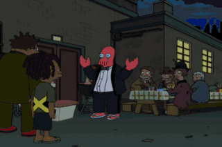 I finally figured out how money could make me happy. By using it to buy my hungry friends a feast! - Hooray! - Yeah! Everyone, join us. Oysters Rockefeller here has provided genuine turkey dogs.