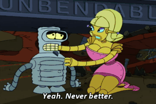 Yeah. Never better. Nah, I'm yankin' your chain. I'm dyin'. You can't die! Tonight Bender showed me that I love you. But... I love you. I know, and I care for you too.