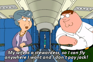 My wife is a stewardess, so I can fly anywhere I want and I don't pay jack!