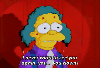 I never want to see you again, you... you clown!