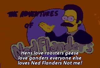 Hens love roosters geese love ganders everyone else loves Ned Flanders Not me! Everyone who counts loves Ned Flanders Knock that off, you two! It's time for church!