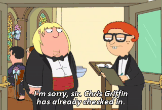I'm sorry, sir. Chris Griffin has already checked in. Well, that's impossible! (SOBBING) Meg, are you ready?