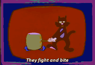 They fight and bite they bite and fight and bite bite, bite, bite fight, fight, fight the itchy and scratchy show - Ow. - Hee-hee-hee. - Ow. - Hee-hee-hee. - Ow. - Hee-hee-hee. This is a rather lifeless outing.