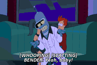 (WHOOPING) (SCATTING) BENDER: Yeah, baby! Do the back dance, do the back dance. (GROANING) FARNSWORTH: Good news, everyone.