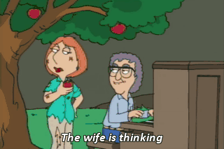 The wife is thinking takes a long, hard look at Randy 5 times, fat old husband's walking over Let's get the hell outta here.