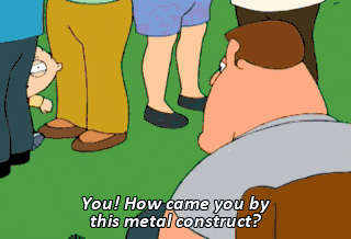 You! How came you by this metal construct? I demand to know who made you! Stewie, it's not polite to point. I'm so sorry. That's ok, Lois.