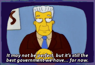 It may not be perfect, but it's still the best government we have... for now. Hmm? Oh, yes. By the way, the spacecraft's still in extreme danger.