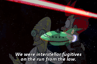 We were interstellar fugitives on the run from the law. Fire all weapons and open a hailing frequency for my victory yodel. (ALL SCREAMING)