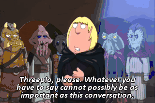 Threepio, please. Whatever you have to say cannot possibly be as important as this conversation.