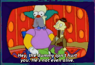 Hey, the dummy can't hurt you. He's not even alive. He's dead!