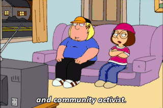 and community activist. Go, Dad. He can't hear you. Go, Dad! So fasten your seat belts. We're just minutes away from Lois versus Peter, Griffin versus Griffin on Monday Night Debate, y'all!