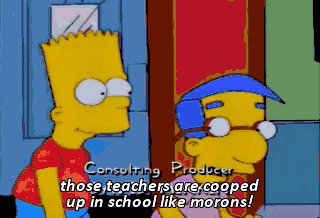those teachers are cooped up in school like morons! Mmm, here we go again. Skinner! Ah. No day would be completely wasted without a visit... to the old joke shop.