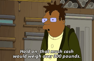 Hold on, that much cash would weigh over 300 pounds. How can Zoidberg walk out with that much weight? And he may be invisible, but he's not insmellable.