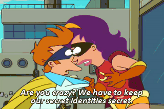 Are you crazy? We have to keep our secret identities secret. From everybody? Especially from everybody. Give several reasons why. For one,