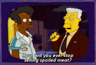 Apu, will you ever stop selling spoiled meat? No. I mean, yes. I mean-- Uh-oh. I think I come off very well. Monster! Run, children!