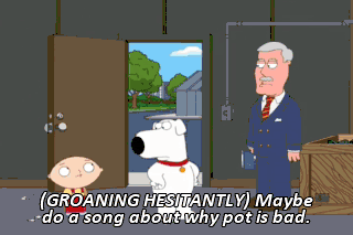 (GROANING HESITANTLY) Maybe do a song about why pot is bad. And that's why pot is bad (ALL CHEERING) I've heard all I need to make an informed decision. Marijuana is hereby re-illegalized.