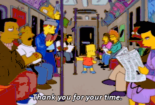 Thank you for your time. Aw, come on! Pick up the pace! Hey, I'm not a bum. Thanks, but I don't need-- Okay, if you insist, but-- Spare change, lady? Lousy cheapskate.