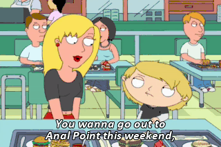 You wanna go out to Anal Point this weekend, see what all the buzz is about? OMG, that'd be so awesome! Sweet. We're gonna have a real raging time. Before you know it, we'll be like an old married couple. (SLURPING)