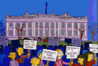 Homer, I've got to sneak these valuable artworks out of the White House, but I can't get out of my driveway because of these protesters. Mr. President, those young people are about to get a dose of reality.