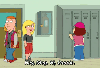 Hey, Meg. Hi, Connie. I can't fit all my books in my locker. Can I put the rest of them on your ginormous ass? (LAUGHING) Hey, Connie, hi. Peter Griffin, Meg's father. Say, can you do me a favor?