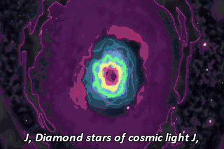 J, Diamond stars of cosmic light J, J, Quasars shine through endless night J, J, And everything is one in the beauty J, J, And now we say goodbye J, Aah!