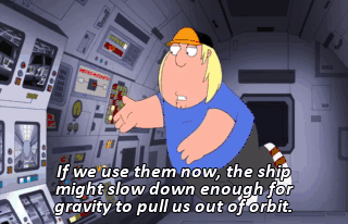 If we use them now, the ship might slow down enough for gravity to pull us out of orbit. PETER: That's an egg that I hucked at you for being a nerd.